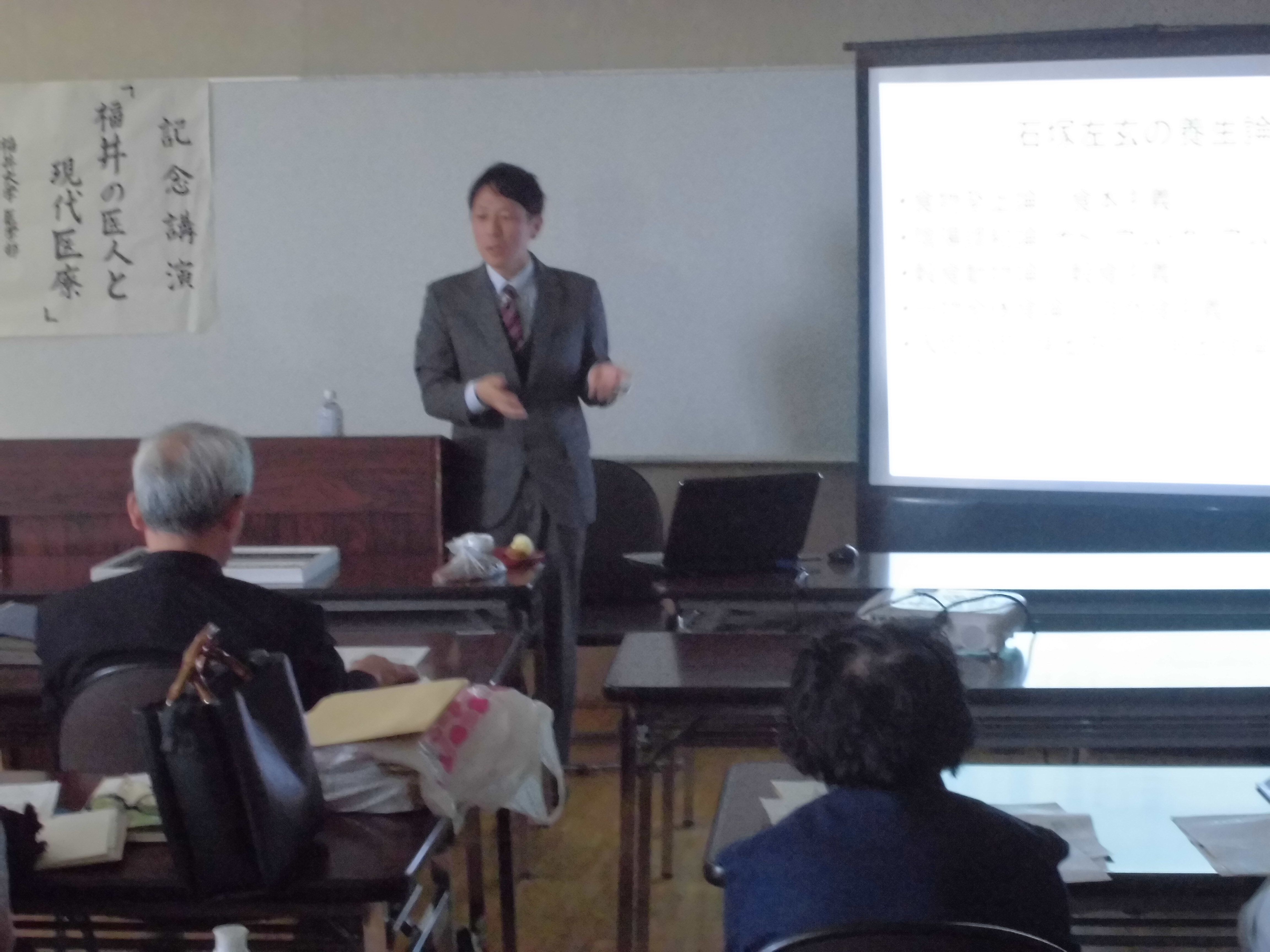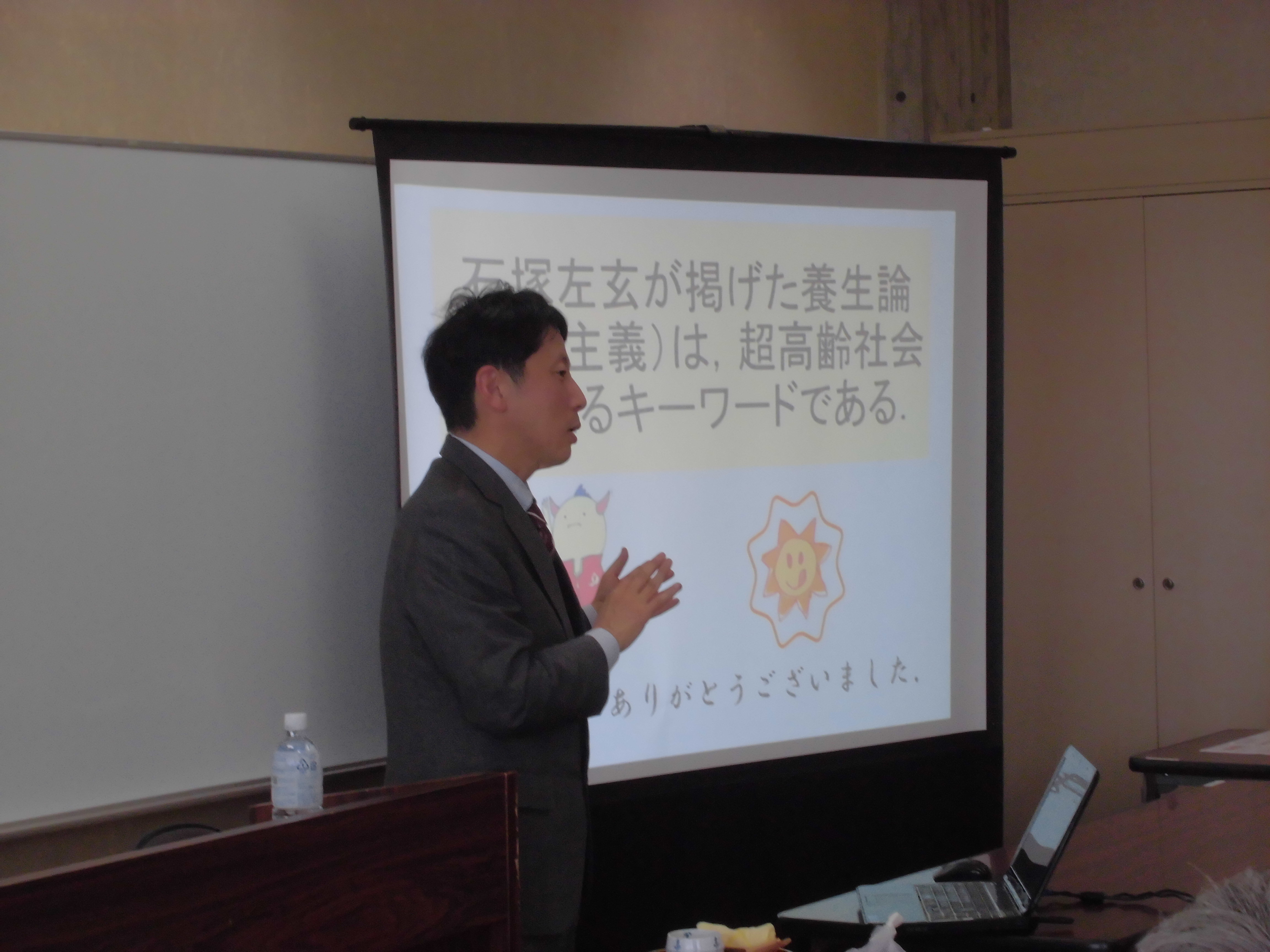 平成29年度NPO法人フードへルス石塚左玄塾総会を開催しました、 ユ・アイふくいにて9時30分~開催。今回は30名弱の参加を得て6議案を提案。 会員から『後期高齢者に向かって元気に過ごしたいが、光り輝く光輝高齢者を目指したい』とのご意見など活発で前向きな発言がありました。協議終了後記念講演と捨て福井大学の山村修先生に、「福井の医人 石塚左玄と現代医療」の演題で①食育と石塚左玄②食事バランスの重要性③サルコペニア(加齢性筋肉減弱症)について④サルコペニアの治療には運動と栄養⑤石塚左玄は超高齢社会を支えるキーワードである。について貴重なご講演を頂きました。これらについても病気持ちの方から真剣な質問がありました。非常にお忙しい山村先生に感謝です。昼食は小豆玄米ご飯とみそ汁等を調理室で作って皆で『頂きます』合唱です。